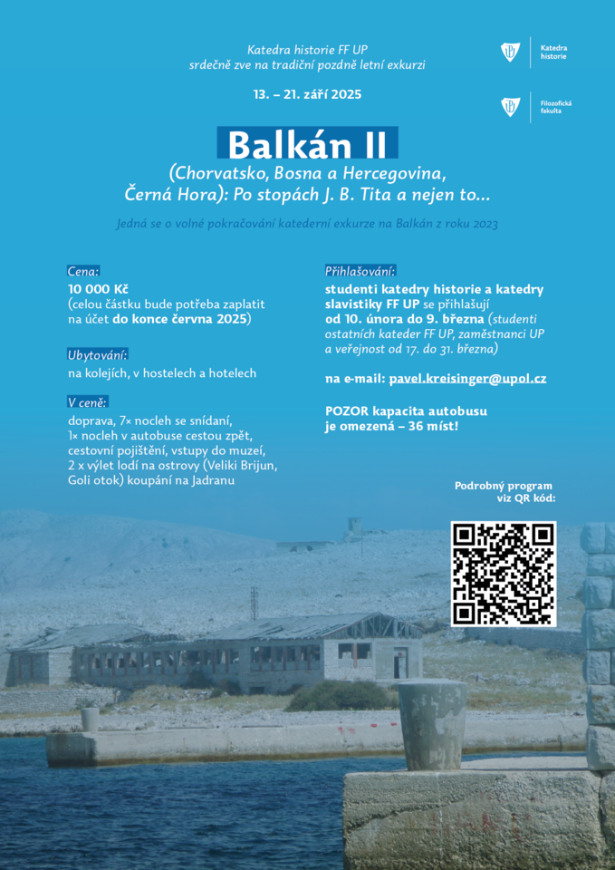 kredity: s ohledem na datum konání exkurze žádáme studenty katedry historie, kteří se chtějí exkurze zúčastnit, aby si předmět KHI/XE (Odborná historická exkurze - 3 kredity) zapsali až dodatečně po návratu z exkurze