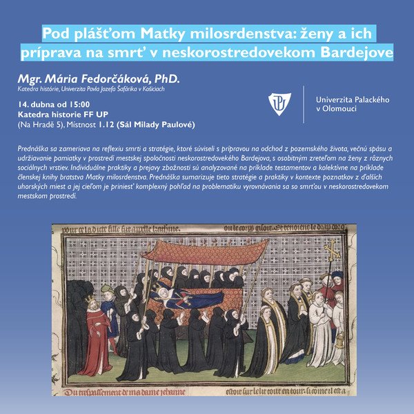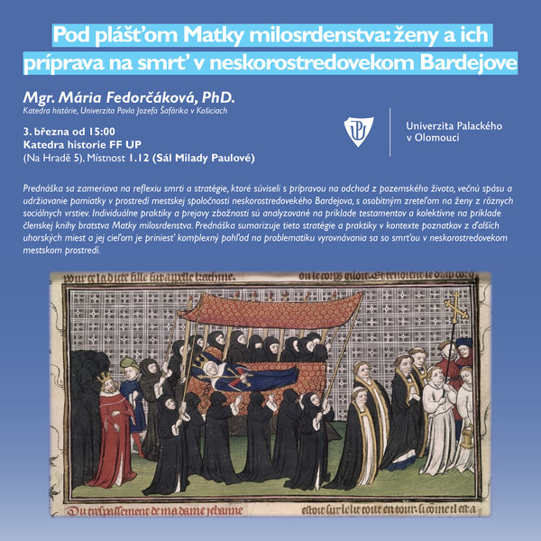 Prednáška sa zameriava na reflexiu smrti a stratégie, ktoré súviseli s prípravou na odchod z pozemského života, večnú spásu a udržiavanie pamiatky v prostredí mestskej spoločnosti neskorostredovekého Bardejova, s osobitným zreteľom na ženy z rôznych sociálnych vrstiev. Individuálne praktiky a prejavy zbožnosti sú analyzované na príklade testamentov a kolektívne na príklade členskej knihy bratstva Matky milosrdenstva. Prednáška sumarizuje tieto stratégie a praktiky v kontexte poznatkov z ďalších uhorských miest a jej cieľom je priniesť komplexný pohľad na problematiku vyrovnávania sa so smrťou v neskorostredovekom mestskom prostredí.